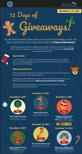 •Promotion Overview: 12 Days of fun activities featured on Blue Carpet. Daily winners randomly selected, based on activity completion.