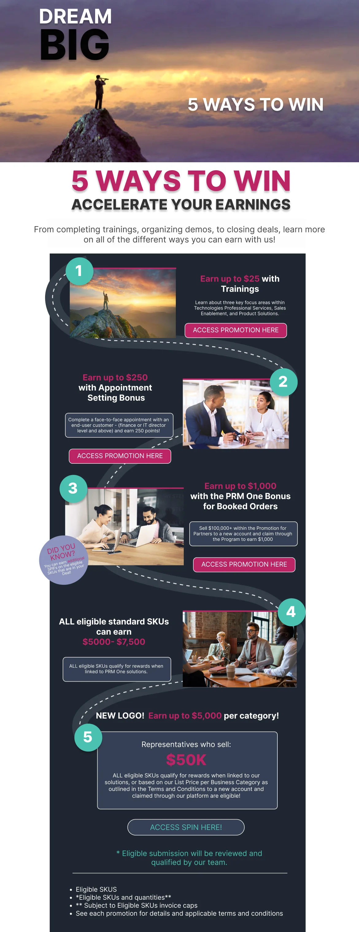 The '5 Ways to Win' promotion guides representatives through the various stages of a buyer's journey, rewarding them at each milestone. From initial training to the final deal closure, this initiative celebrates every step of the process, not just the ultimate achievement.