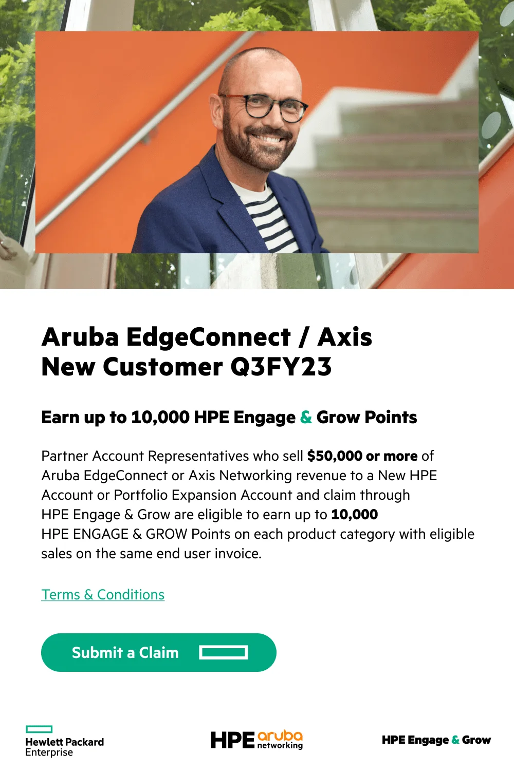 Partner Account Representatives who sell $50,000 or more ofAruba EdgeConnect or Axis Networking revenue to a New HPE Account or Portfolio Expansion Account and claim throughHPE Engage & Grow are eligible to earn up to 10,000 HPE ENGAGE & GROW Points on each product category with eligiblesales on the same end user invoice.