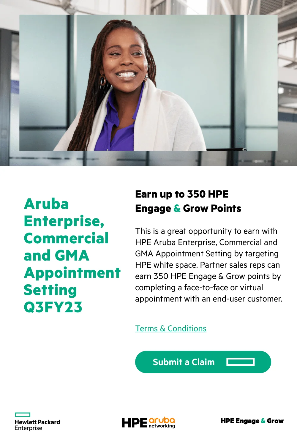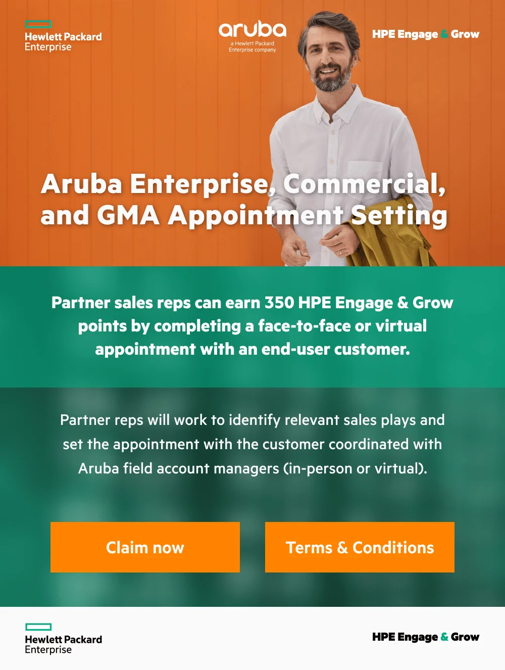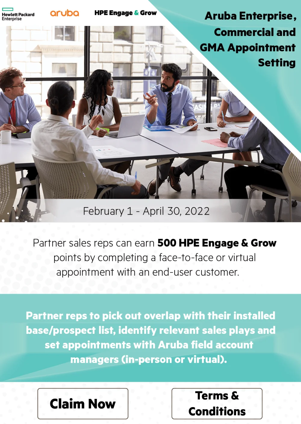 Partner sales reps can earn 500 HPE Engage & Grow points by completing a face-to-face or virtual appointment with an end-user customer on Aruba Enterprise Products.