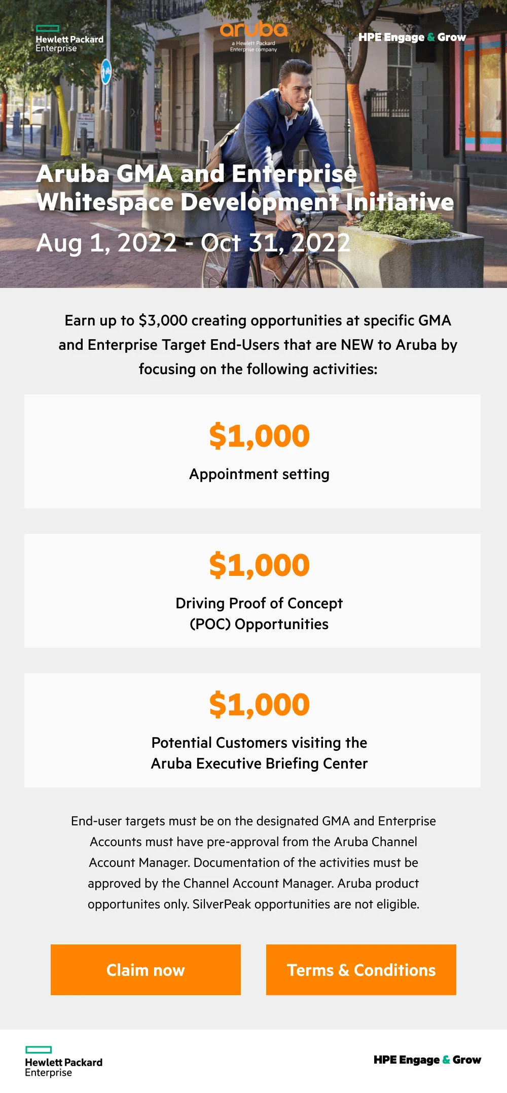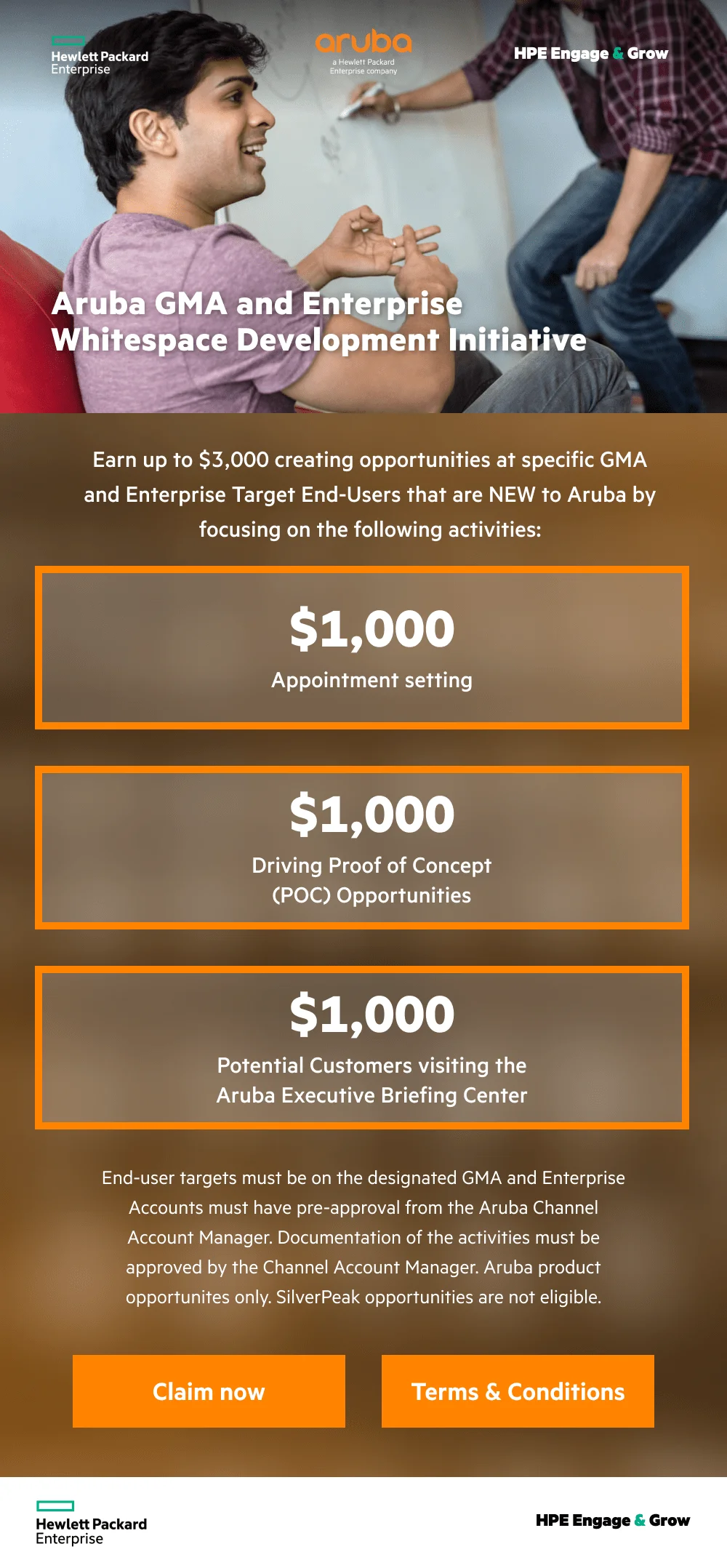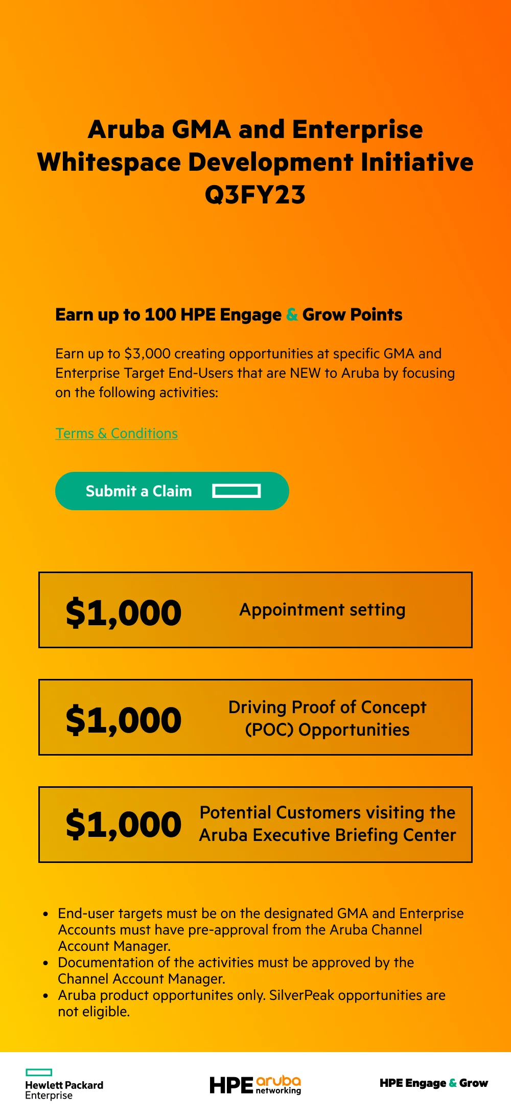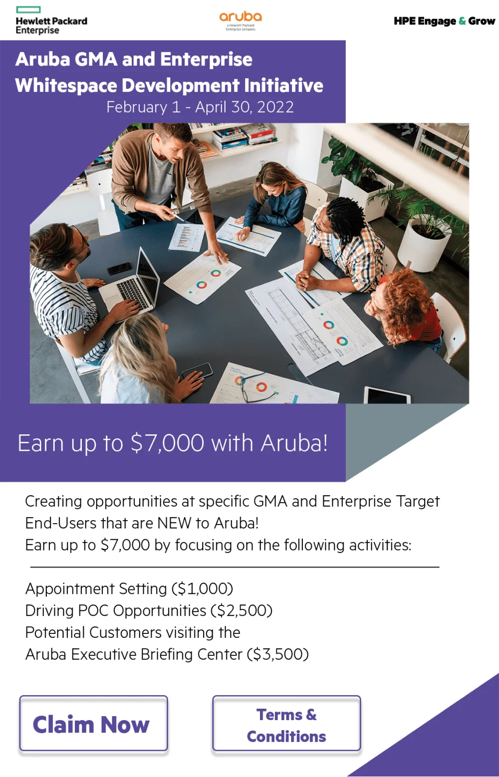 Reps can Earn up to $7,000 creating opportunities at specific GMA and Enterprise Target End-Users that are NEW to Aruba by focusing on the following activities: Appointment Settings, Driving Poof of Concept, and Potential customers visiting physical Aruba Executive briefing center.