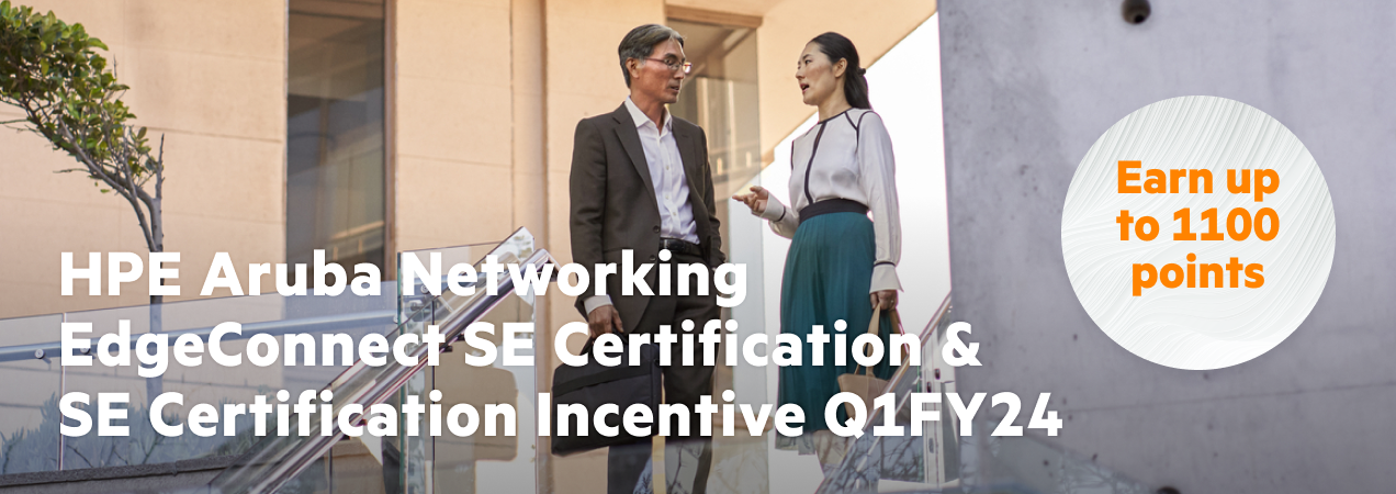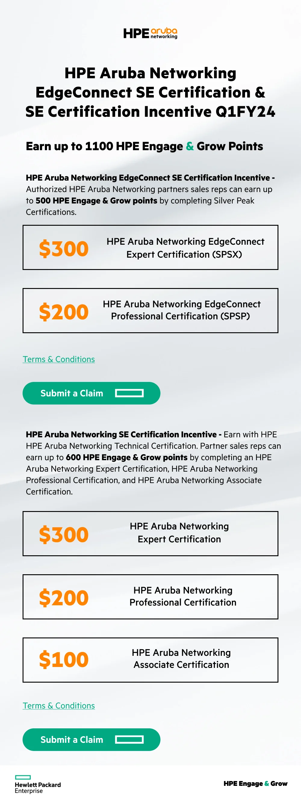 Authorized HPE Aruba Networking partners sales reps can earn up to HPE Engage & Grow points by completing Silver Peak Certifications about Aruba Networking.