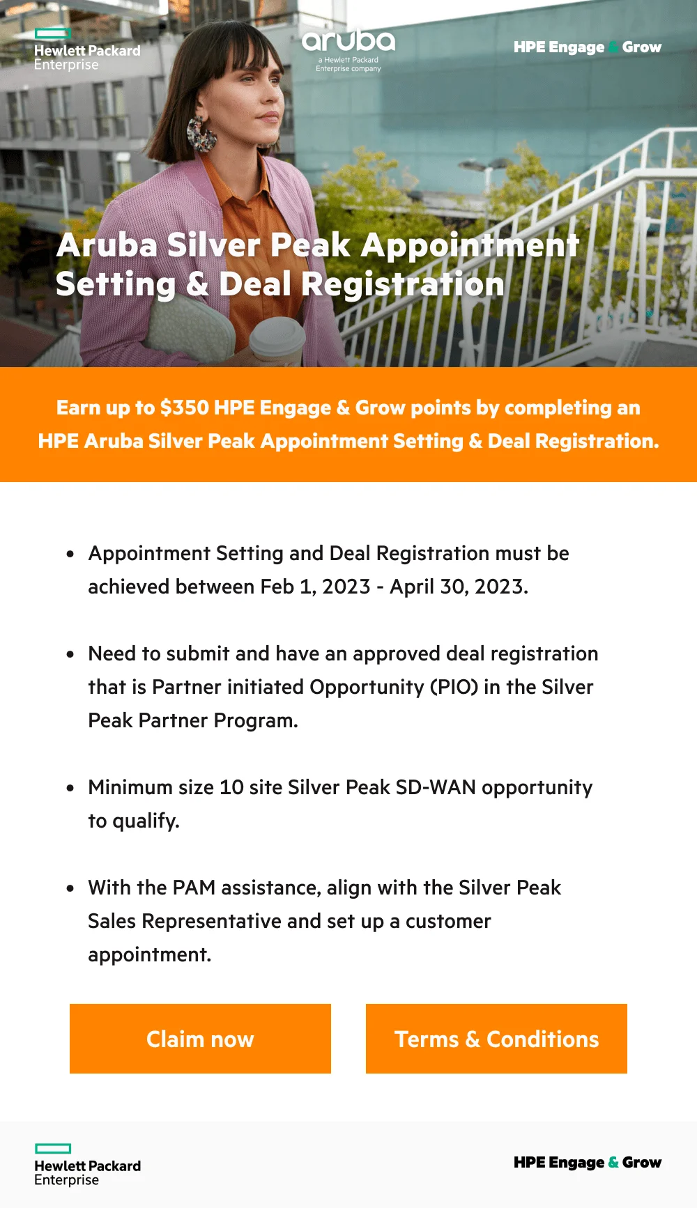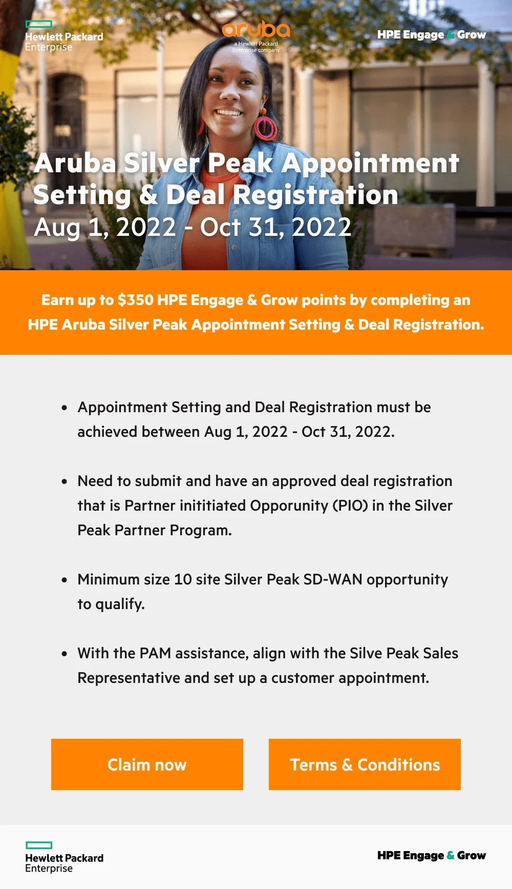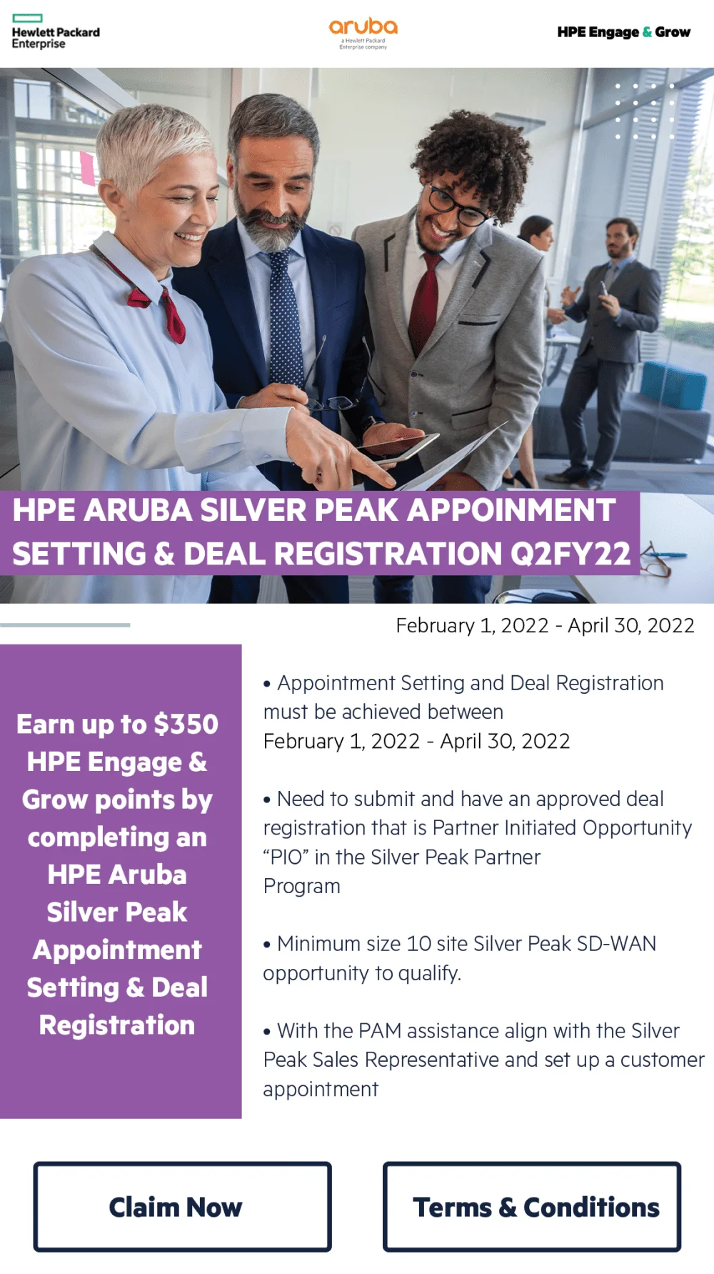 Reps can Earn up to $350 HPE Engage & Grow points by completing an HPE Aruba Silver Peak Appointment Setting & Deal Registration.
