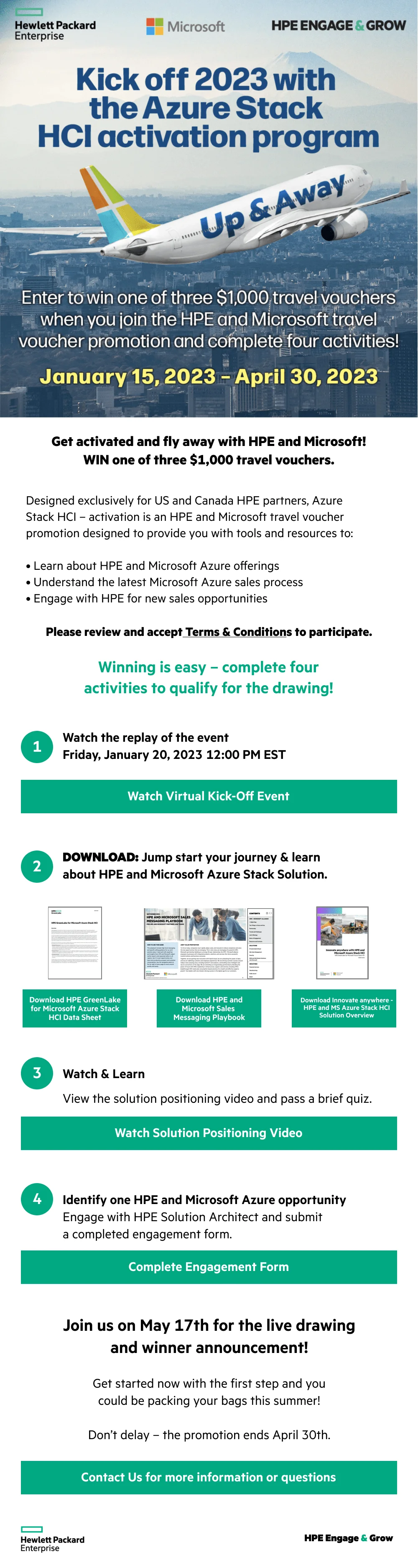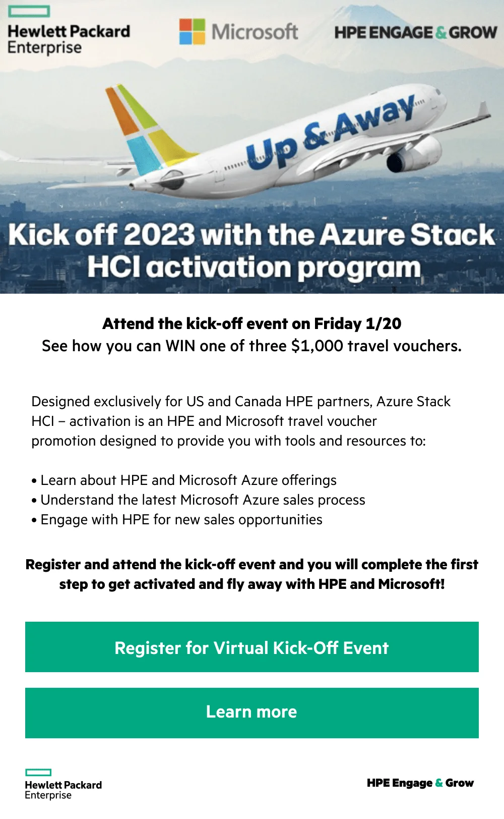 Designed exclusively for US and Canada HPE partners, Azure Stack HCI – activation is an HPE and Microsoft travel voucher promotion designed to provide you with tools and resources to:• Learn about HPE and Microsoft Azure offerings• Understand the latest Microsoft Azure sales process• Engage with HPE for new sales opportunities