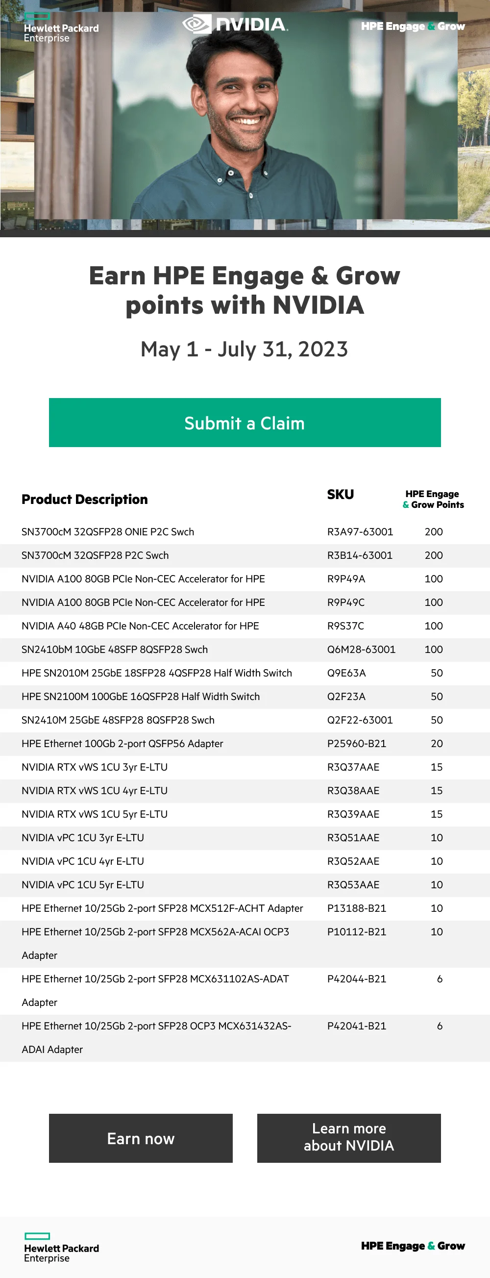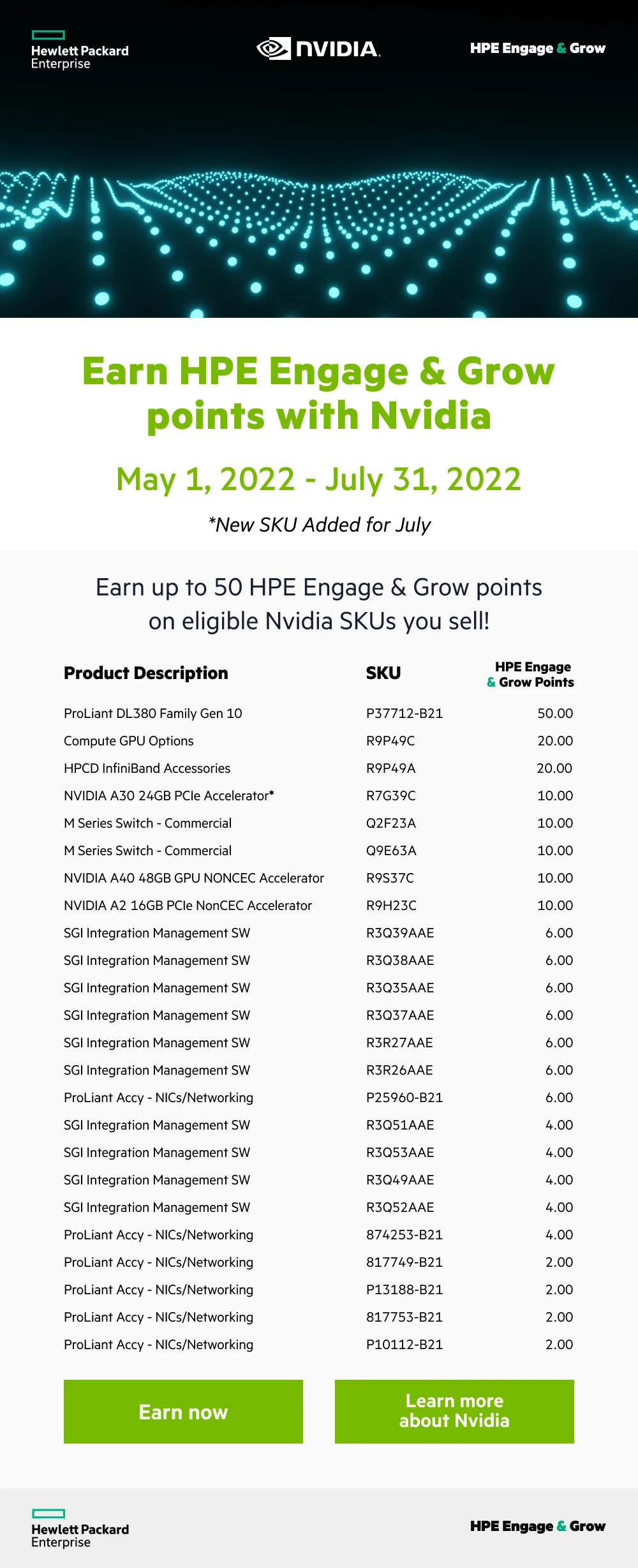 HPE holds this promotion quarterly. Reps can earn up to 50 HPE Engage & Grow points on eligible Nvidia SKUs they sell.