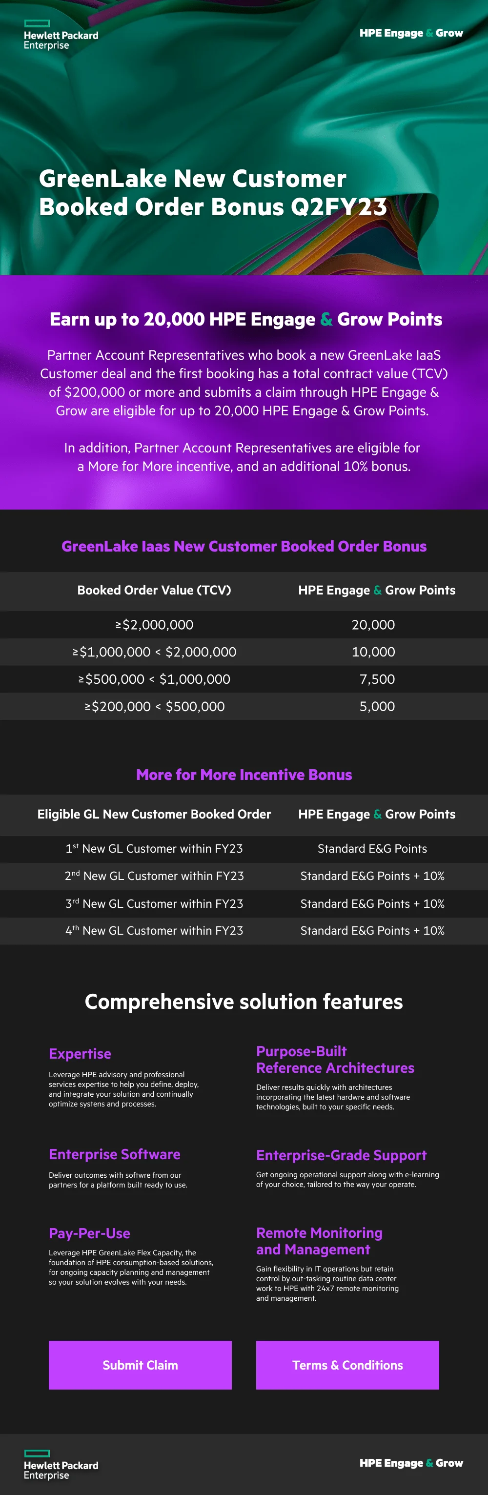 Partner Account Representatives who book a new GreenLake IaaS Customer deal and the first booking has a Total Contract Value (TCV) of $100,000 or more and submits a claim through HPE Engage & Grow are eligible for up to 20,000HPE Engage & Grow Points. In addition, if the new GreenLake IaaS Customer deal is a Quick Quote (QQ) or Integrated Quote (IQ) an additional 10% will be added to the Standard Engage & Grow points award, also Partner Account Representatives are eligible for a More for More incentive, an another additional 10% bonus.