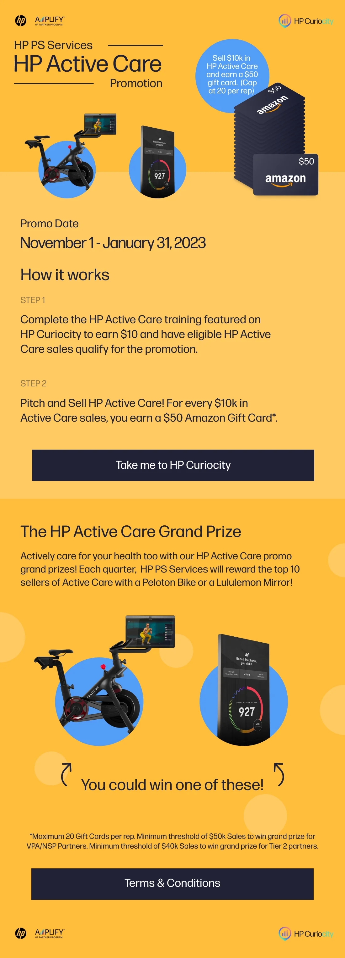 Reps, each quarter, HP PS Services will reward the top 10 sellers of Active Care with a Peloton Bike or a Lululemon Mirror!