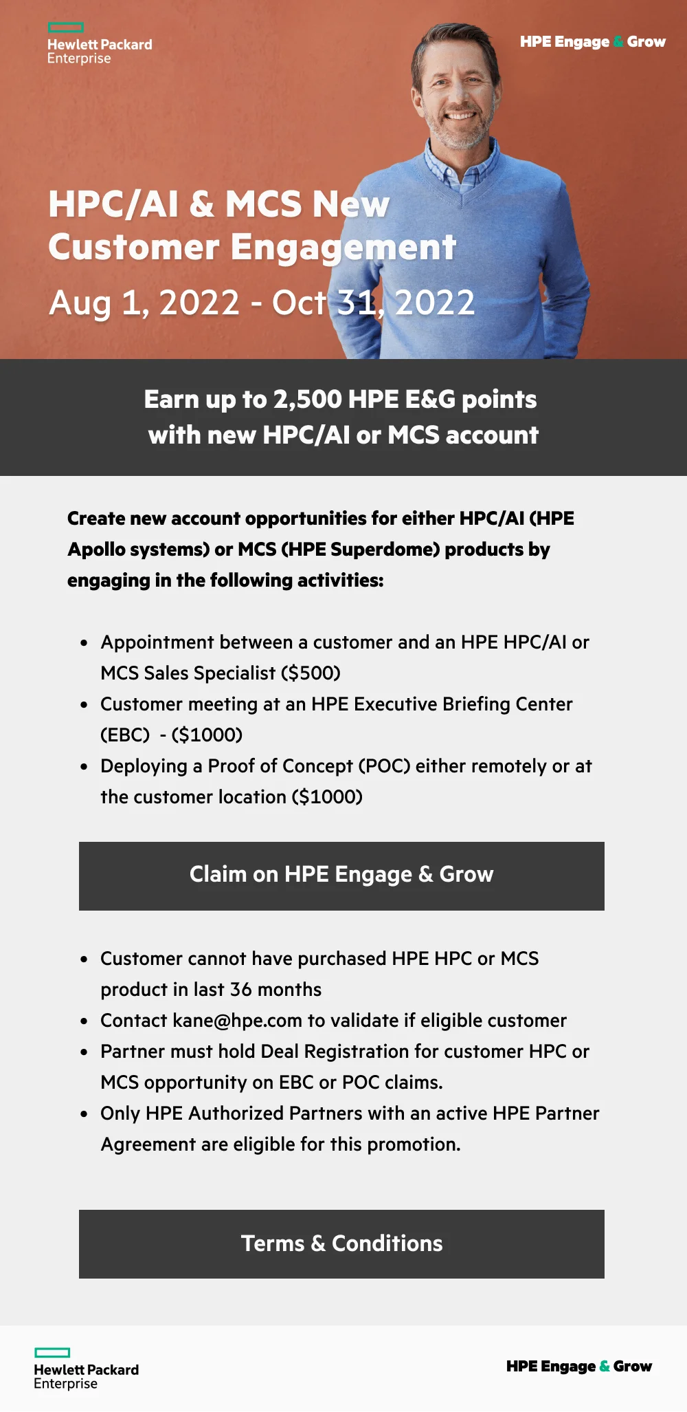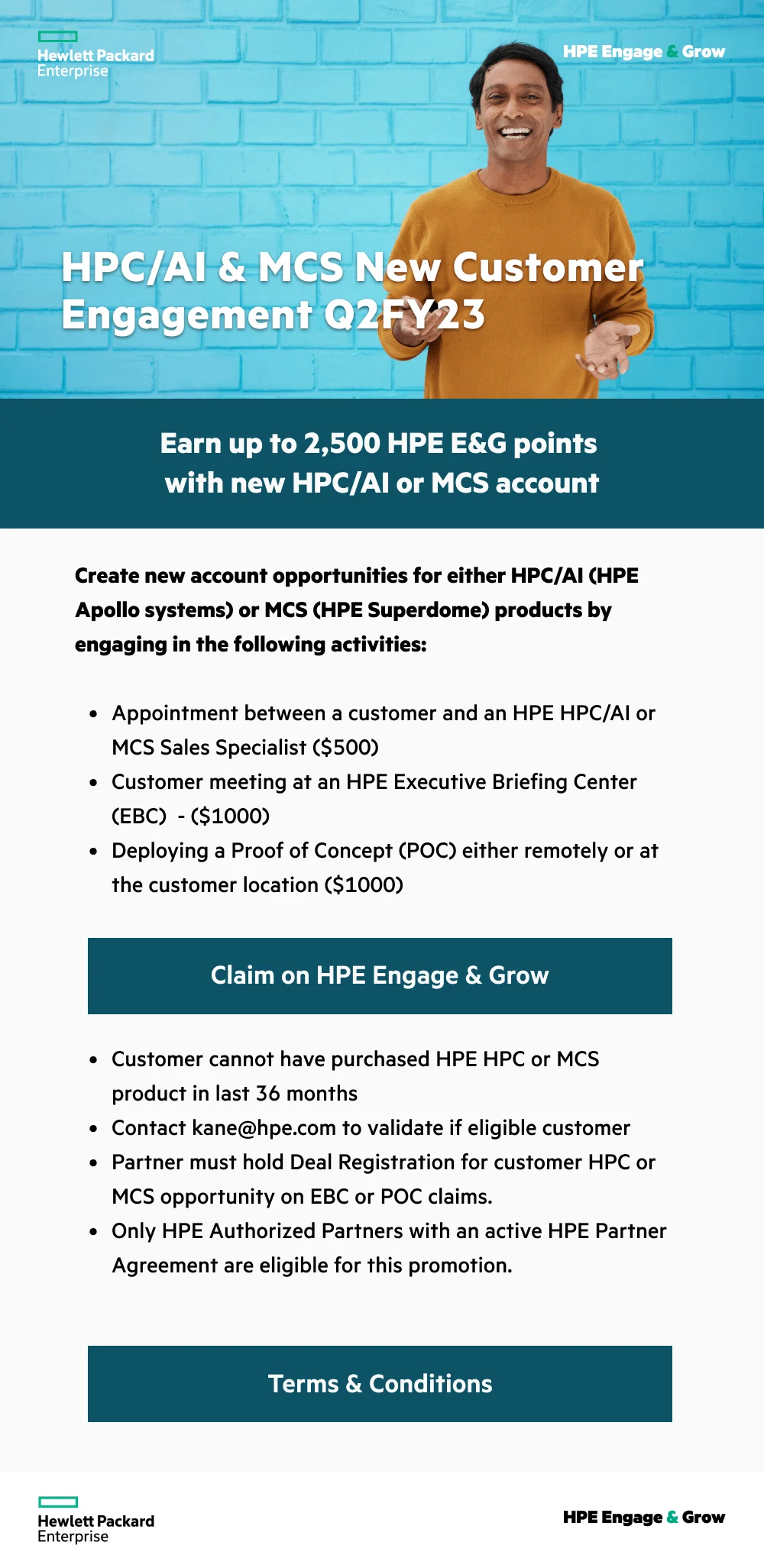 Create new account opportunities for either HPC/AI (HPE Apollo systems) or MCS (HPE Superdome) products by engaging in the following activities: Appointment between a customer and an HPE HPC/AI or MCS Sales Specialist ($500)Customer meeting at an HPE Executive Briefing Center (EBC) - ($1000)Deploying a Proof of Concept (POC) either remotely or at the customer location ($1000)