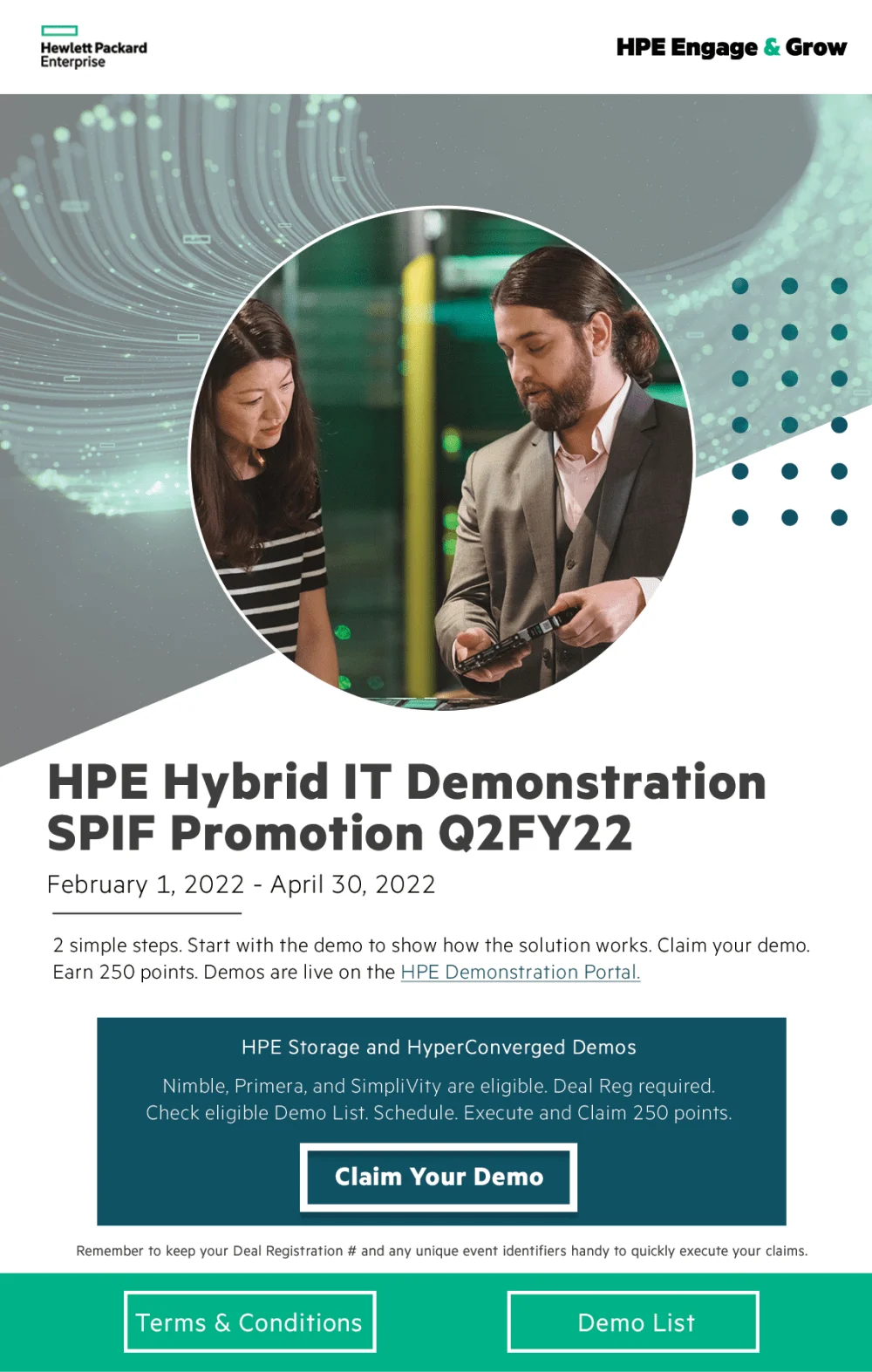 Reps who book a demo to show Nimble, Primera, and SimpliVity HPE Products earn 250 points.