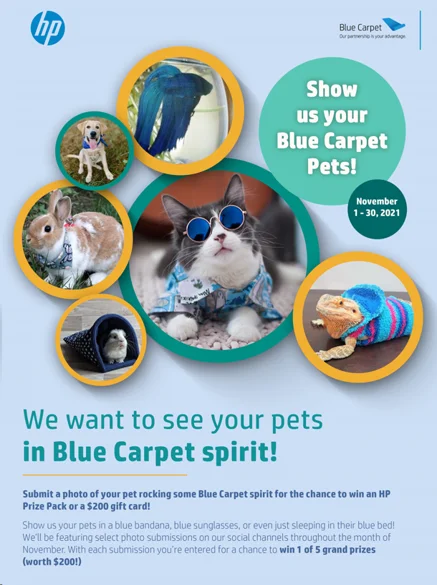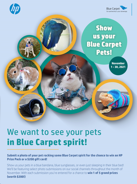 •Promotion Overview: Submit a photo of a pet in Blue Carpet spirit (Blue theme) for a chance to win an HP Prize pack or a $200 Gift Card