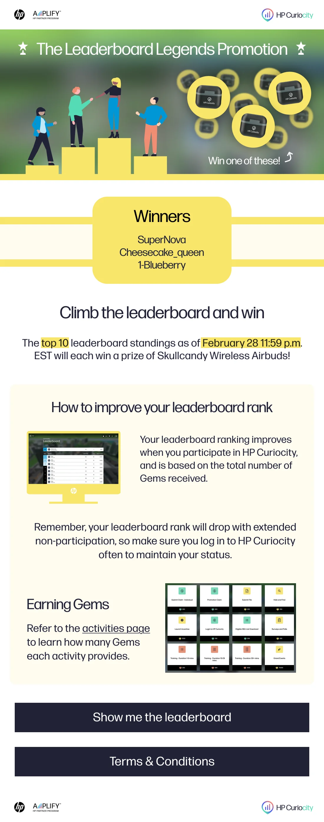 •Promotion Overview: Close the month at the top of the HP Curiocity Leaderboard and win a pair of HP Curiocity branded Skull candy Wireless AirBuds.
